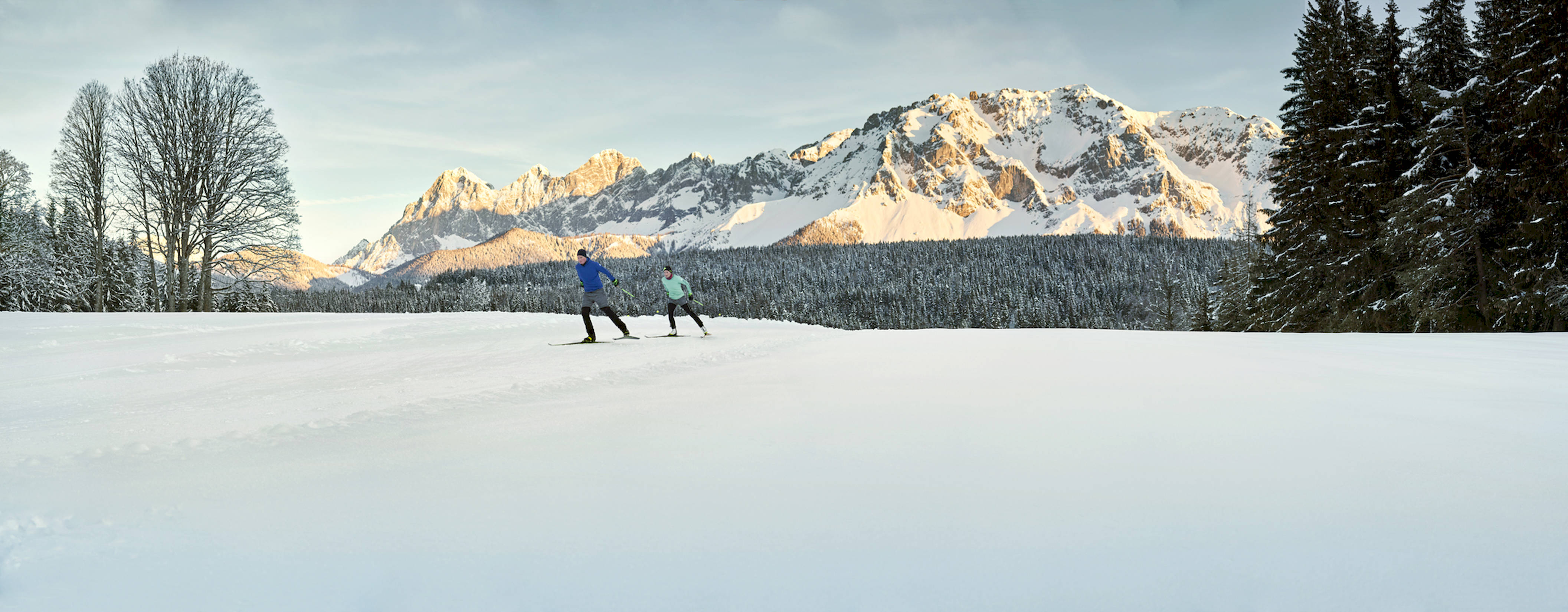 Rund um den Feichtlehnerhof befindet sich ein wahres Langlaufparadies: über 220 km bestens präparierte Loipen für Klassiker und Skater. Vom sonnigen Plateau bis zur Höhenloipe am Dachstein-Gletscher – rund zwanzig abwechslungsreiche Routen bieten Genuss und Herausforderung zugleich. Der Einstieg in die Loipe ist ganz unkompliziert: Über einen Skiweg, der direkt beim Haus beginnt, gelangt man direkt ins Loipennetz. Den Einstieg zur Nachtloipe findest du im Langlaufstadion Ramsau Ort – ganz in der Nähe.